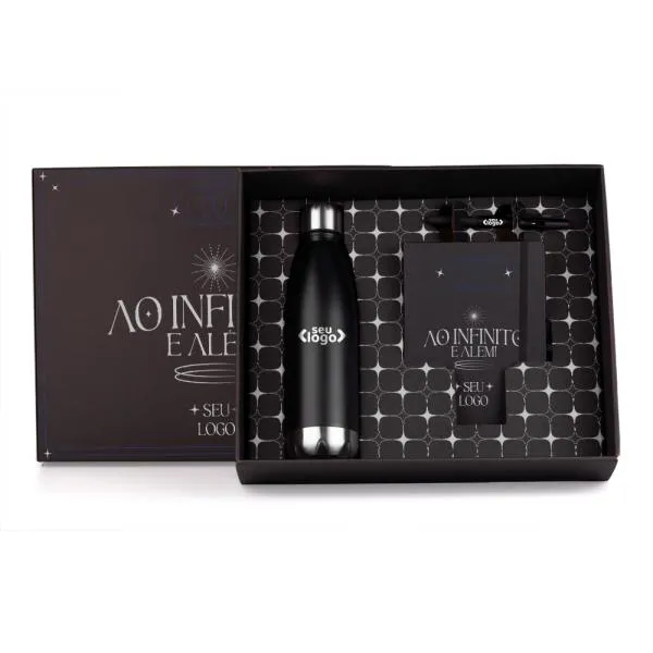 - Dois tipos de gravação: Laser na garrafa e Silk Screen no caderno oferecem acabamentos distintos e adequados a cada material, valorizando a aplicação da logomarca
