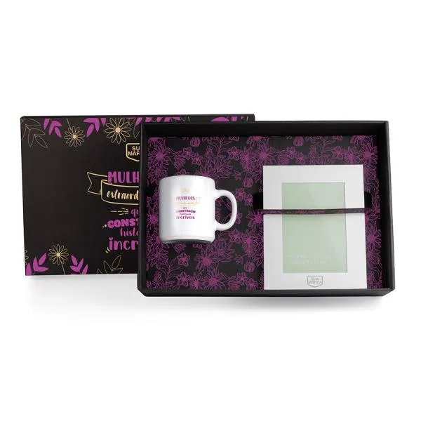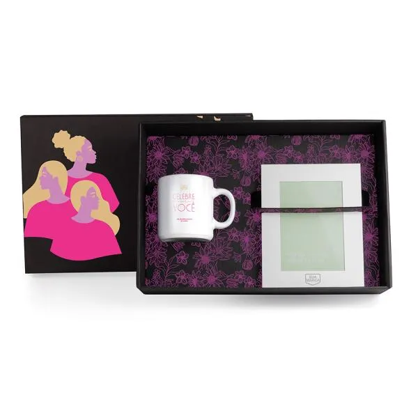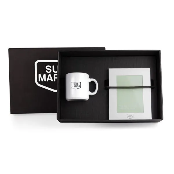 - Dois pontos de contato com sua marca: A caneca e o porta-retrato são itens que ficam em espaços visíveis do dia a dia, mantendo a presença da sua empresa de forma natural