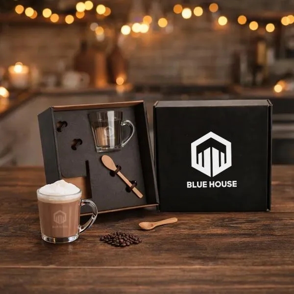 - Dois pontos de personalização: Canecas e embalagem recebem a marca da empresa, ampliando a presença visual da sua identidade no momento da entrega e no uso diário