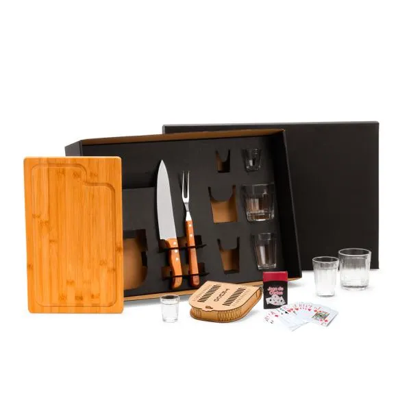 Kit Churrasco, Drinks e Truco. Composto por tábua para Churrasco em Bambu; faca 8″ e garfo trinchante em Madeira/Inox; dois copos americanos multiuso, dois copos americanos para Drink e dois copinhos americanos para dose em vidro; caixa para truco com jogo de cartas, marcador de tentos e jogos em MDF.