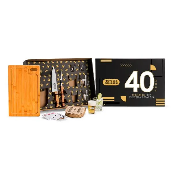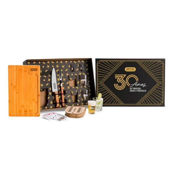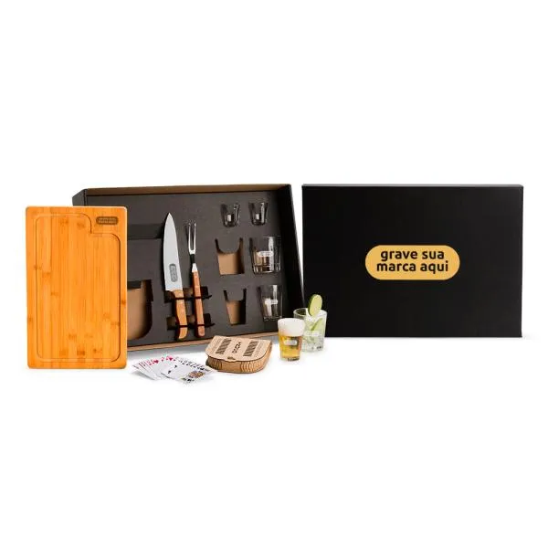 - Personalização: Gravação a laser nos seis copos, na tábua e na lâmina da faca; gravação em silk/digital na tampa da caixa