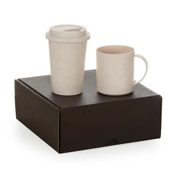 - Composição do kit: Uma caneca e um copo, ambos em fibra de bambu com PP