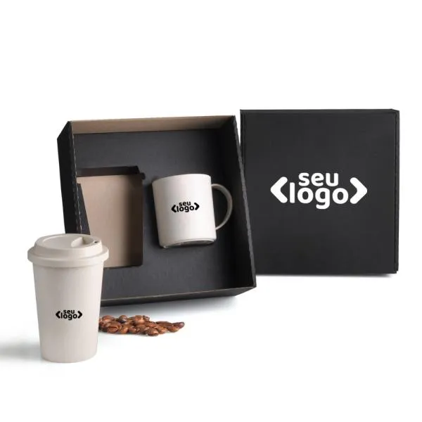 - Três pontos de personalização em um kit: A gravação em silkscreen no copo, na caneca e na tampa da caixa amplia a presença visual da sua marca sem necessidade de peças adicionais