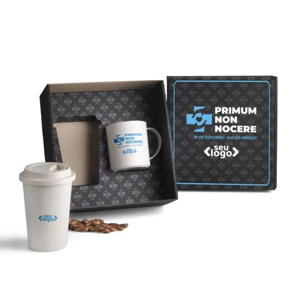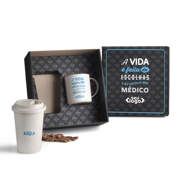 - Formato de kit: A combinação de caneca com alça e copo com tampa e abertura atende diferentes momentos de uso, aumentando a presença da marca no dia a dia de quem recebe