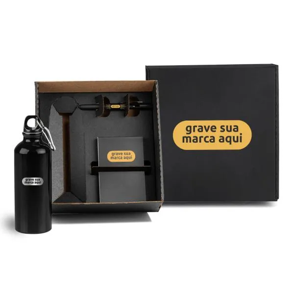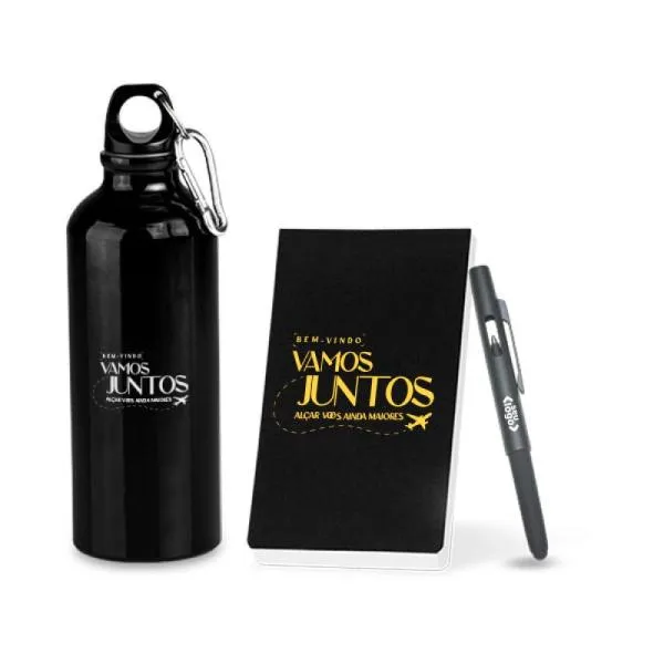Conta com garrafa em alumínio 500ml, caneta em ABS preta e bloco para anotações.