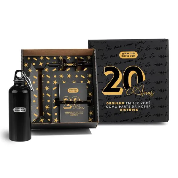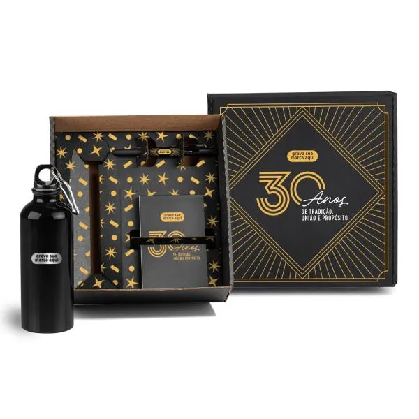 - 🎨 Personalização: Gravação a laser na garrafa; silk screen na caneta e no bloco