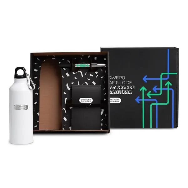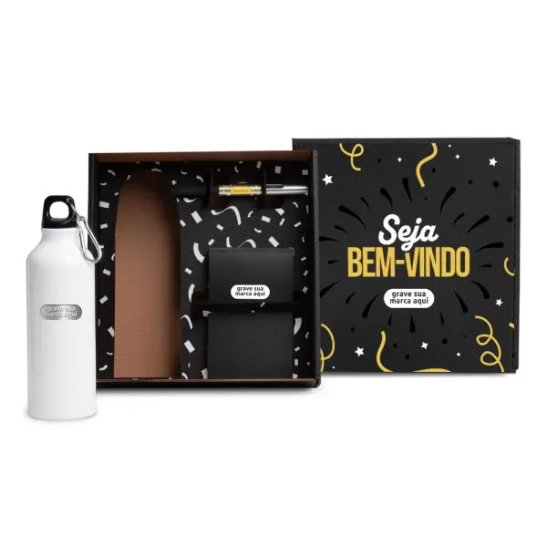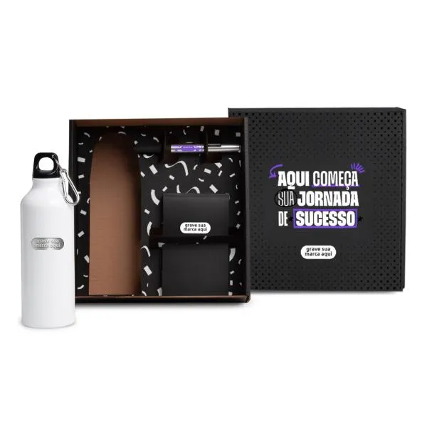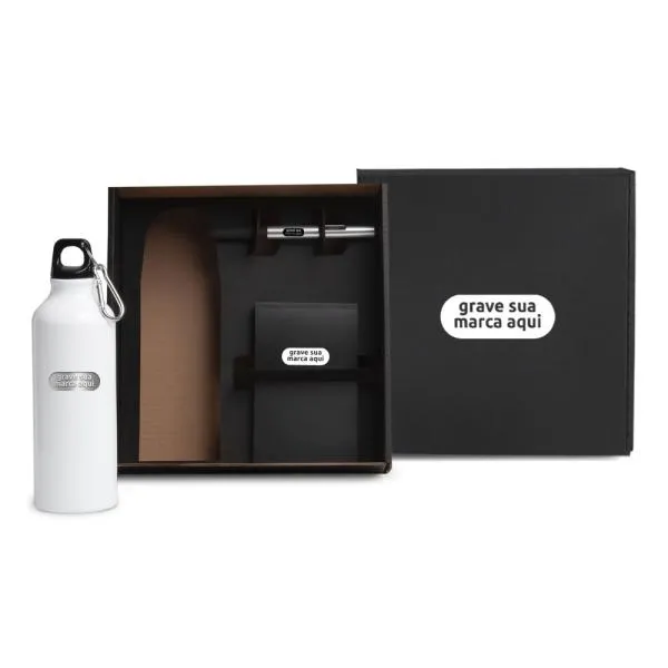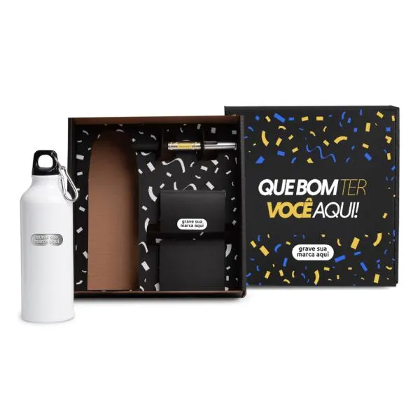 - Conjunto com identidade visual unificada: Squeeze, caneta, bloco e tampa da caixa recebem a sua marca, criando uma apresentação coesa e profissional desde o primeiro contato
