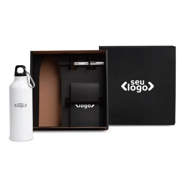 Composto por garrafa em alumínio branca com capacidade de 500ml; caneta em ABS prata e bloco para anotações preto.