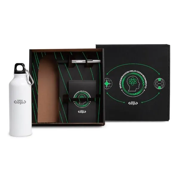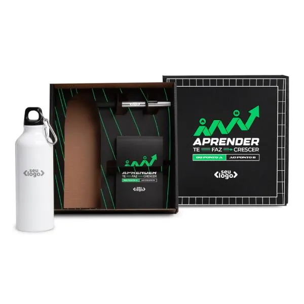 Kit com squeeze de alumínio 500ml, caneta e bloco para anotações em caixa preta — um conjunto prático e visualmente coeso para reforçar a presença da sua marca em treinamentos corporativos, capacitações e eventos de desenvolvimento. Ideal para empresas que buscam brindes funcionais que acompanham o participante dentro e fora do ambiente de aprendizado. Com personalização em laser na squeeze e silk screen no bloco, caneta e tampa da caixa, cada peça do kit comunica a identidade da sua marca com consistência.