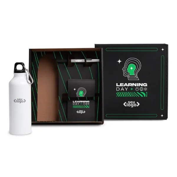 - Presença em múltiplos pontos: Com quatro superfícies de personalização — squeeze, bloco, caneta e tampa da caixa — sua marca aparece de forma consistente em cada item do kit