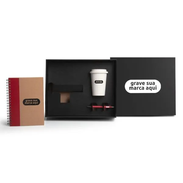 Gravação: Uma gravação a Laser na caneta; uma gravação em Silk Screen no caderno, copo e na tampa da caixa.