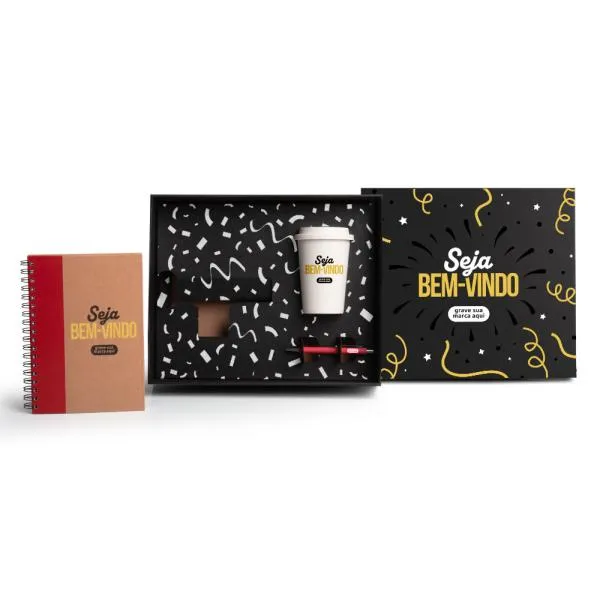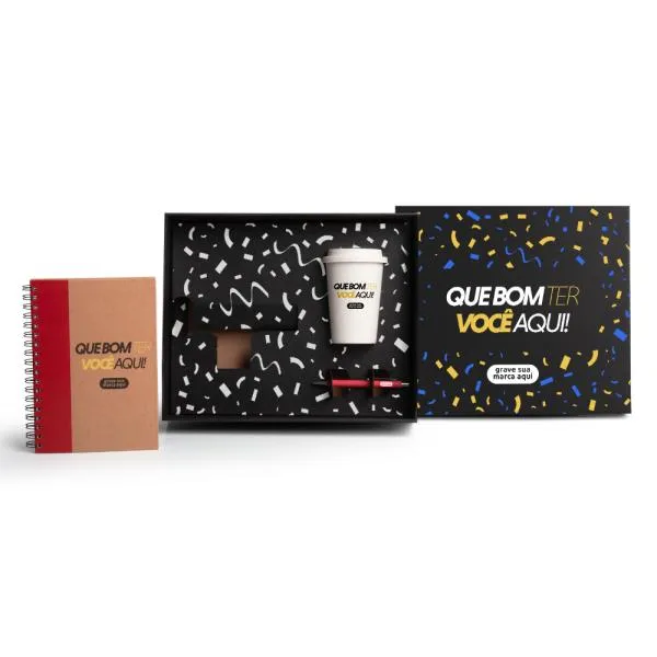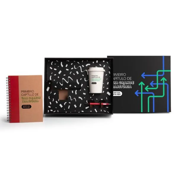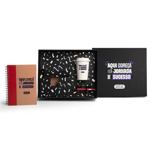 - Personalização em múltiplas peças: Sua marca aparece em quatro pontos do kit — caderno, copo, caneta e tampa da caixa — ampliando a presença visual da empresa no dia a dia de quem recebe