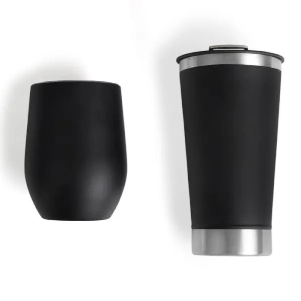 - Composição do kit: 2 copos térmicos em aço inox com tampa, nas capacidades 340ml e 500ml