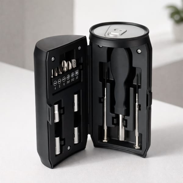 Kit de ferramentas com 13 peças em aço carbono. O conjunto conta com chave porta-bits magnética com cabo em polipropileno (PP), seis bits em formatos diferentes, sendo 3 de fenda, 2 Phillips e 1 adaptador para soquetes, além de duas chaves de precisão e 4 soquetes sextavados. Acompanha caixa plástica em formato de lata de bebida, com trava de fechamento.