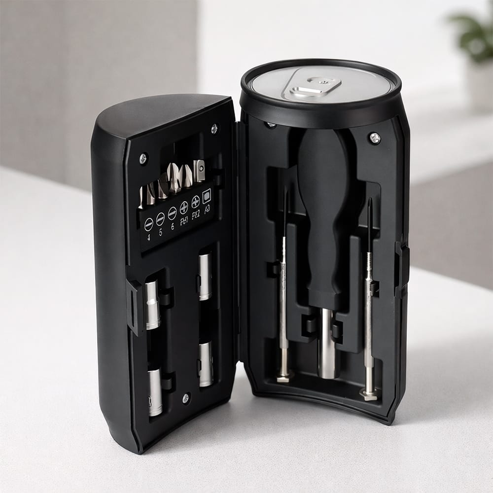 - Apresentação que valoriza o brinde: A embalagem em formato de lata de bebida chama atenção e agrega percepção de cuidado na entrega do kit