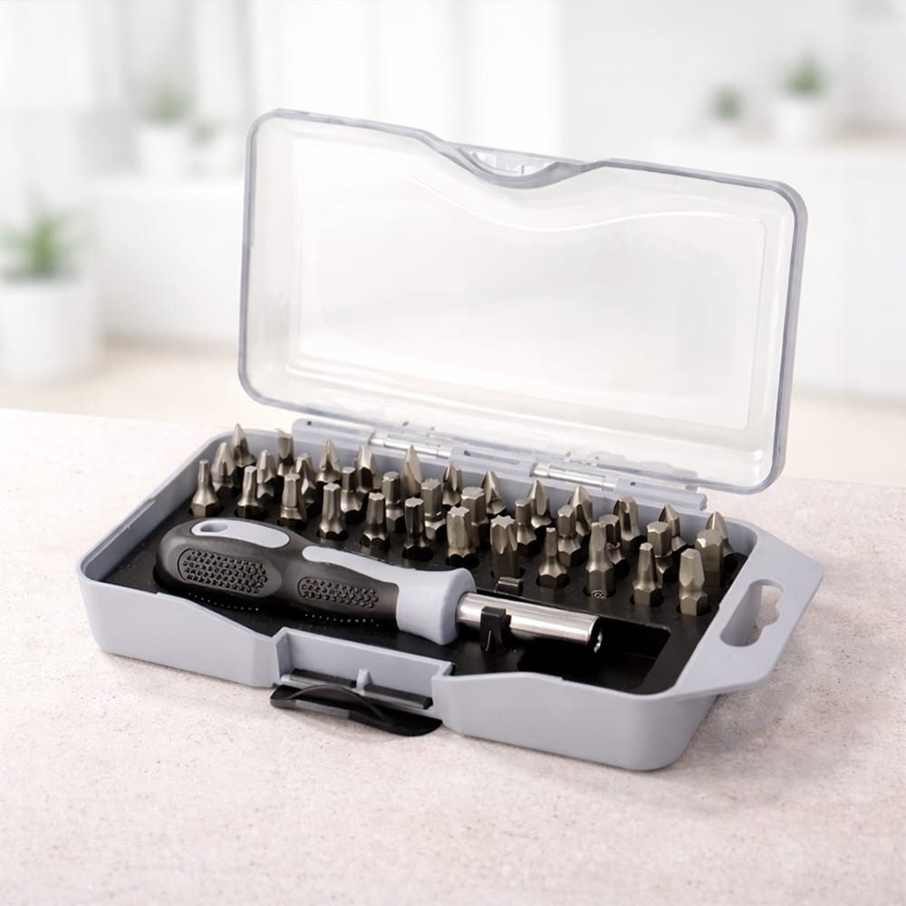 Kit de ferramentas com 37 peças. O conjunto traz uma chave porta-bits com ponta magnética e cabo ergonômico em plástico PP e TPE, além de 36 bits em formatos diferentes, incluindo: 5 com pontas de fenda, 10 Phillips, 9 Allen, 8 Torx e 4 de pontas quadradas. Acompanha caixa em plástico com tampa transparente e trava de fechamento.
