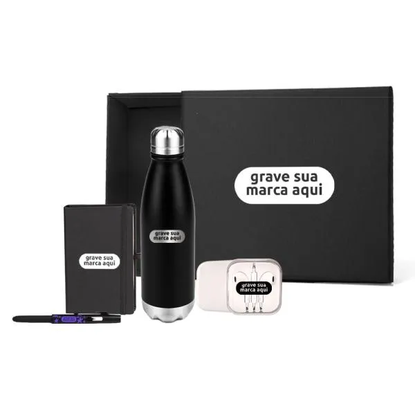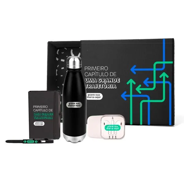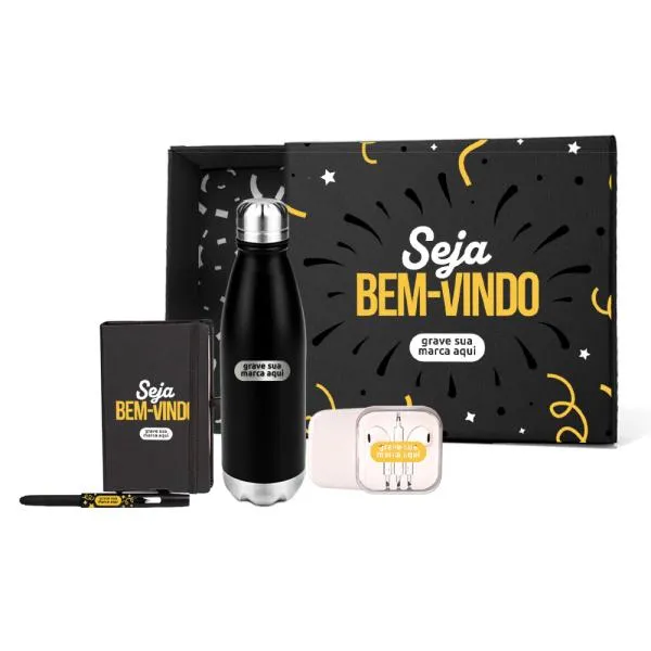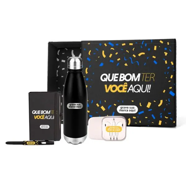 Kit de boas-vindas composto por quatro itens de uso cotidiano, todos personalizados com a identidade da sua empresa, entregues em caixa preta pronta para presentear. Uma forma direta de gerar uma boa primeira impressão em novos colaboradores, parceiros ou clientes desde o primeiro contato. Na White Brindes, você vê o produto no showroom antes de fechar o pedido e recebe o layout virtual gratuito para aprovar a personalização com segurança.