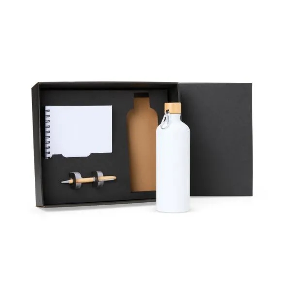 Composto por garrafa em alumínio na cor branca com capacidade de 1 litro; caderno para anotações wire-o branco com capa dura e caneta confeccionada em Bambu ecológico com detalhes em cromado fosco, possuindo carga azul.