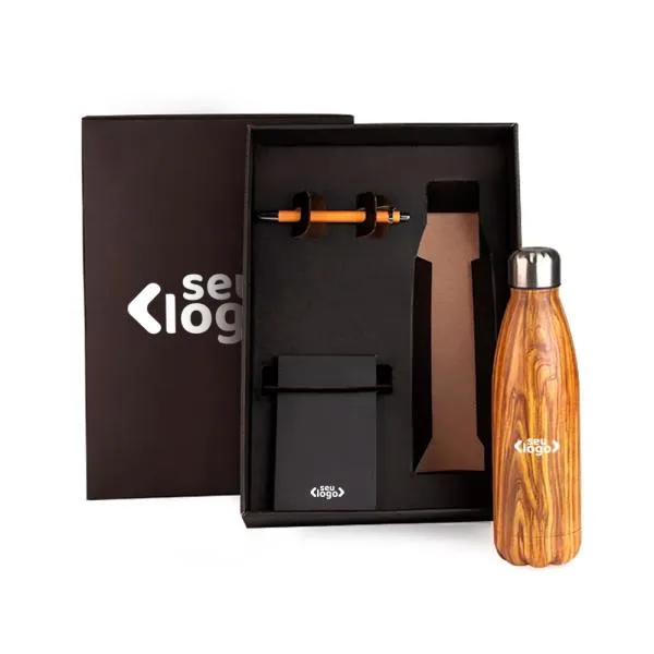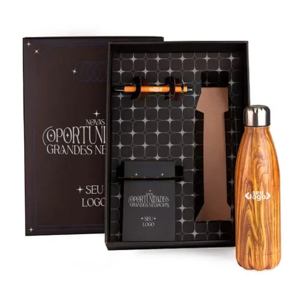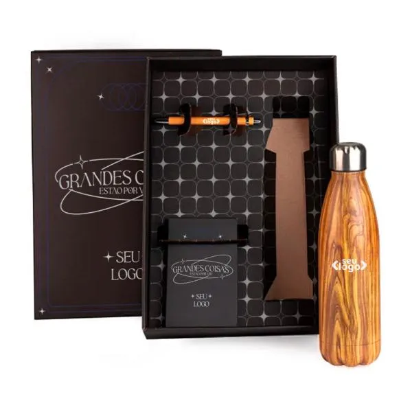 - Personalização em múltiplas técnicas: A laser na garrafa e caneta para durabilidade da marca, e silk ou digital no bloco e na tampa da caixa para maior liberdade visual