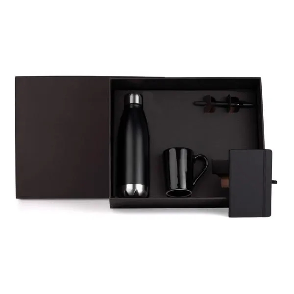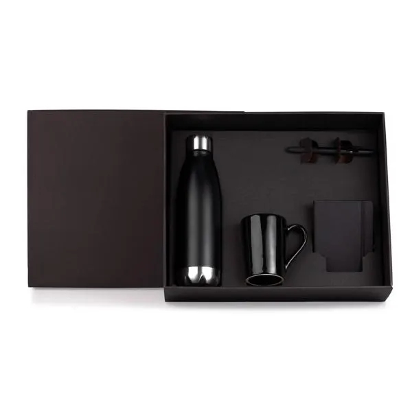 Kit garrafa e acessórios. Composto por garrafa em aço Inox preta com tampa rosqueável; caneca em cerâmica preta; caderno para anotações preto com capa dura e caneta em ABS preta.