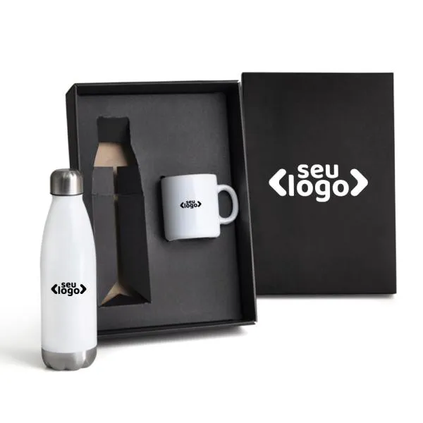 Kit garrafa e caneca. Conta com garrafa em aço inox branca com tampa rosqueável e caneca em cerâmica branca.