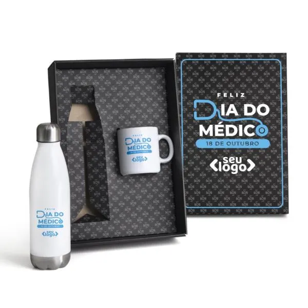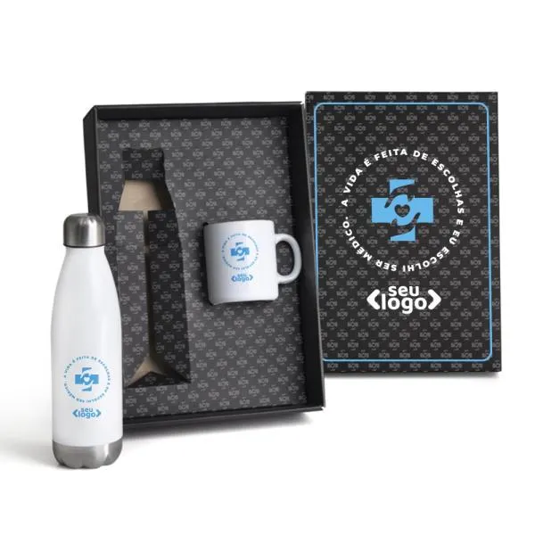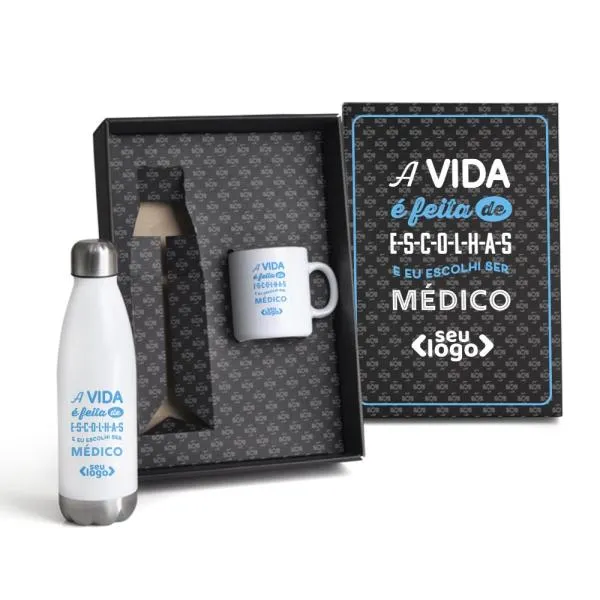Um kit que reúne duas peças funcionais em uma apresentação cuidadosa — garrafa em aço inox e caneca em cerâmica —, pensado para valorizar profissionais da área da saúde de forma significativa. Indicado para empresas e instituições que querem homenagear médicos com algo útil no dia a dia, seja em datas comemorativas ou ações de reconhecimento. Na White Brindes, você visualiza o layout da sua marca antes da produção e pode conferir a qualidade das peças pessoalmente no nosso showroom em Joinville.