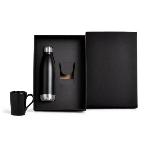 Kit garrafa e caneca. Composto por garrafa em aço inox preta com tampa rosqueável e caneca em cerâmica preta.