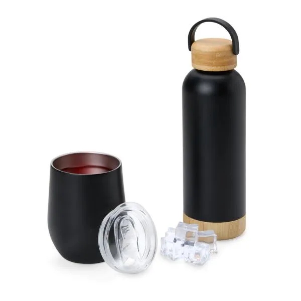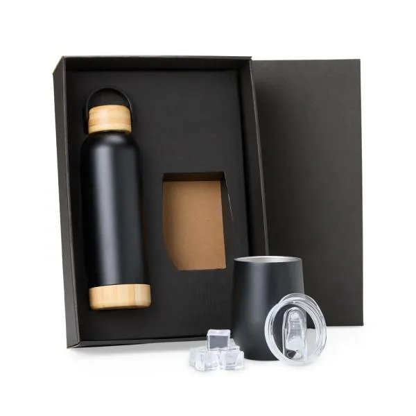 Kit garrafa e copo térmico. Composto por garrafa dupla camada em Inox na cor preta, confeccionada com detalhes em Bambu na tampa e na base, com capacidade de 500ml. Conta também com copo térmico com tampa 340ml, confeccionado com dupla parede de inox, isolada a vácuo.