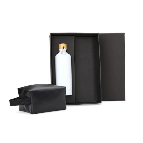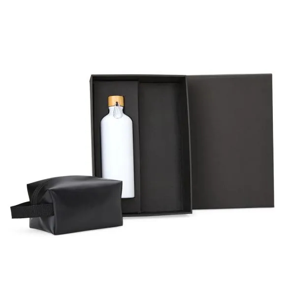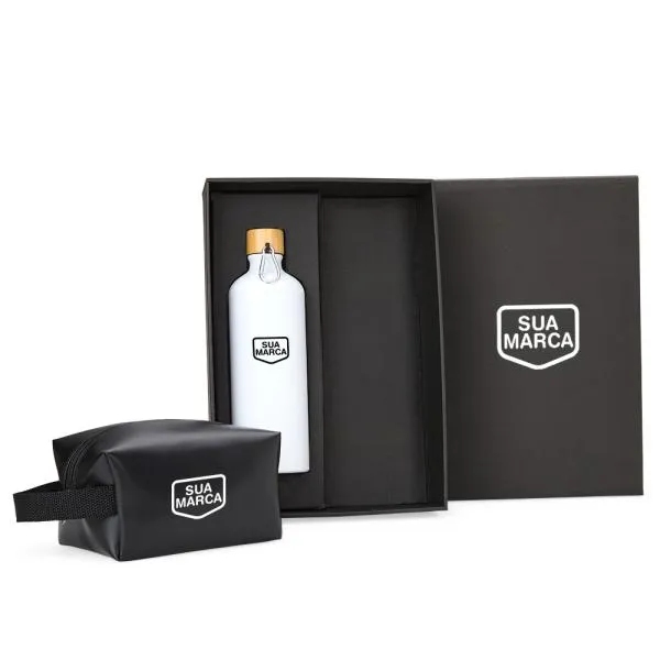 - Composição: Kit com 2 peças — garrafa em alumínio e necessaire com alça