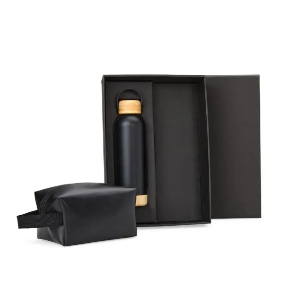 Kit garrafa e necessaire. Composto por garrafa dupla camada em Inox na cor preta, confeccionada com detalhes em Bambu na tampa e na base. Conta também com necessaire com alça em material sintético na cor preta.