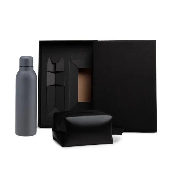 Um kit corporativo que reúne dois itens de uso diário em uma apresentação cuidadosa: garrafa de aço inox com dupla parede e necessaire com alça, entregues em caixa preta. Para empresas que buscam brindes com presença visual e utilidade real no cotidiano de colaboradores, clientes e parceiros. Com personalização em laser na garrafa e silk screen na necessaire e na tampa da caixa, sua marca aparece de forma consistente em todos os elementos do kit.