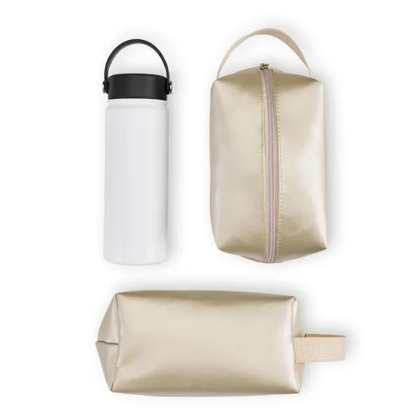 Composto por garrafa em Inox na cor branca, confeccionada com dupla camada e necessaire com alça em material sintético na cor champagne.