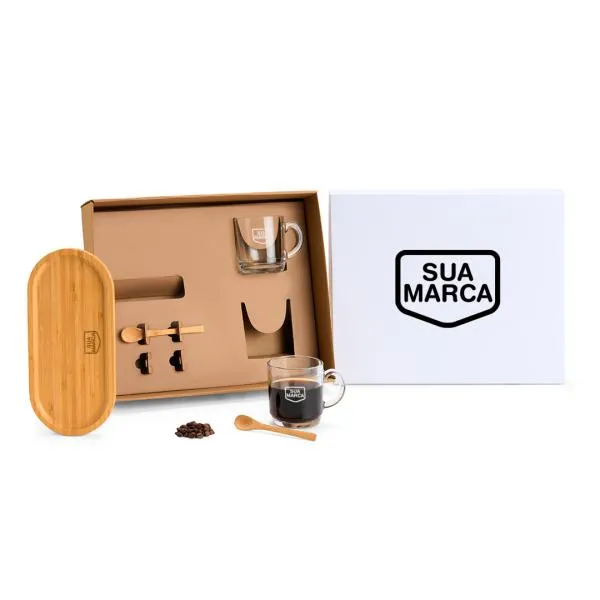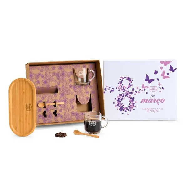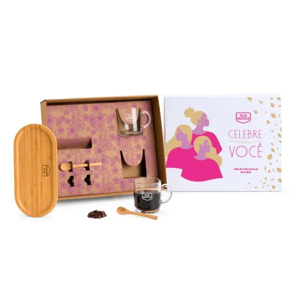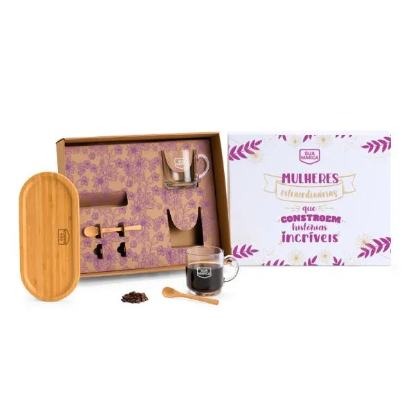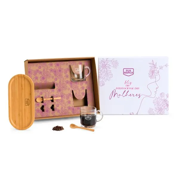 Kit para café com duas canecas de vidro, duas colheres e bandeja em bambu — tudo reunido em uma caixa com tampa branca e personalização a laser e silk. Um brinde que combina funcionalidade e apresentação cuidada, ideal para presentear colaboradoras, clientes e parceiras em datas comemorativas como o Dia das Mulheres. Com a White Brindes, sua marca aparece com identidade e consistência, do layout à entrega.