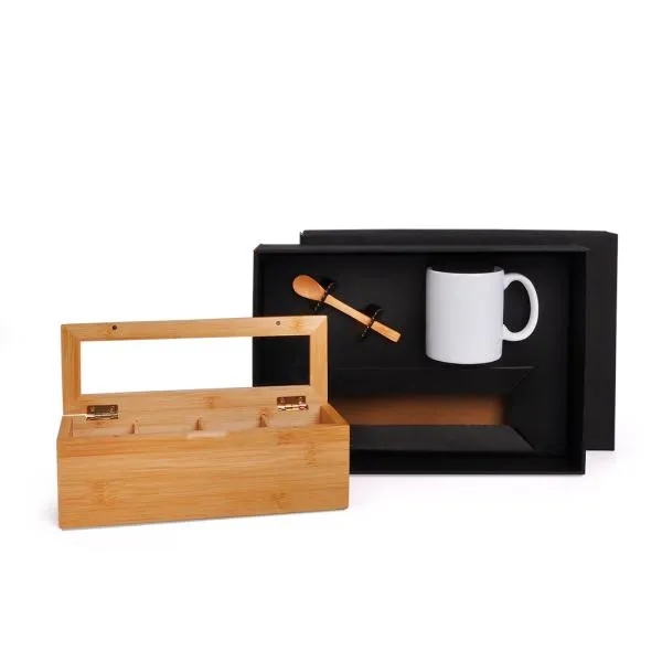 - Composição: Caixa para chás em bambu e poliestireno, colher de 13 cm em bambu e caneca em cerâmica branca