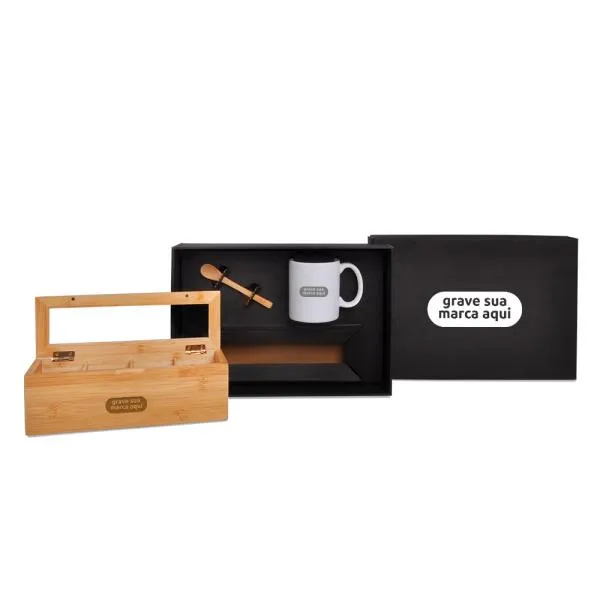 Composto por Caixa para chás em Bambu/Poliestireno; colher de 13 cm em Bambu e caneca em cerâmica branca.