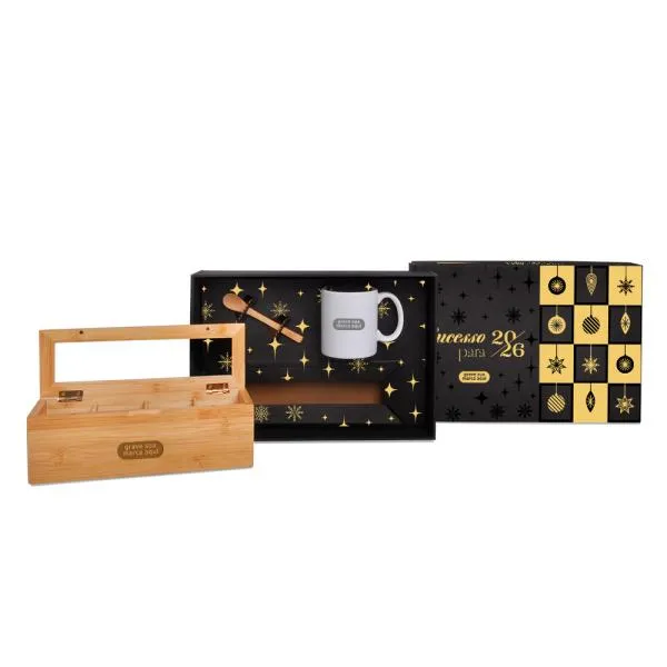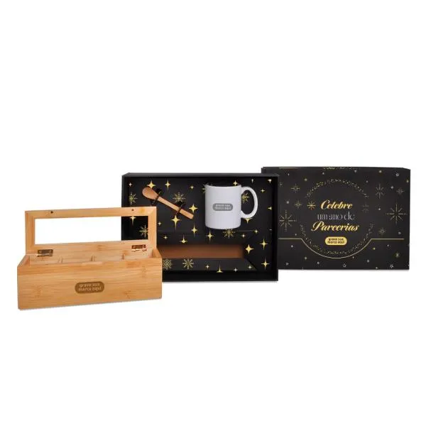 Kit para Chá com caixa em bambu, colher e caneca em cerâmica é uma escolha prática para presentear colaboradores, parceiros e clientes em ações de fim de ano ou confraternizações corporativas. O conjunto combina materiais naturais e funcionais, com espaço para personalização da marca em diferentes pontos do kit. Com a White Brindes, você visualiza o resultado antes da produção e ainda conta com atendimento consultivo para acertar na escolha.