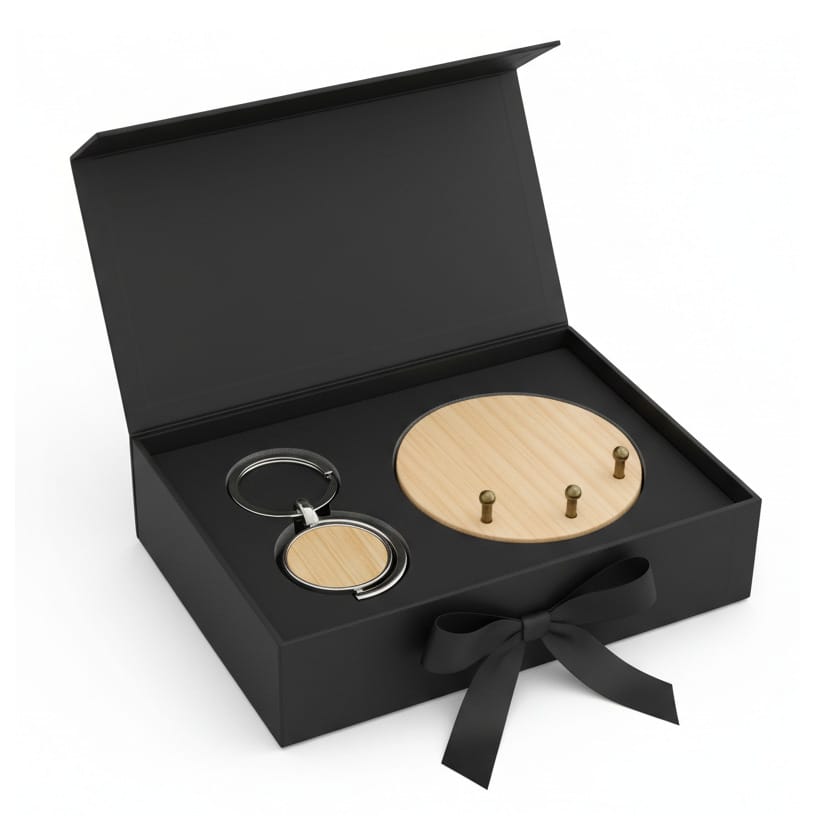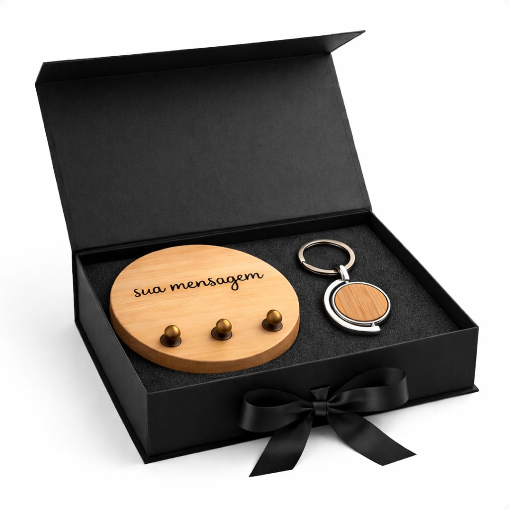 O Kit para Entrega das Chaves com Caixa Rígida é a opção ideal para construtoras, imobiliárias e incorporadoras que desejam transformar o momento da entrega do imóvel em uma experiência marcante e elegante. Composto por um porta-chaves minimalista em madeira natural, um chaveiro em metal e bambu e uma caixa rígida personalizada, o kit une funcionalidade, design e sofisticação — agregando ainda mais valor ao seu empreendimento.