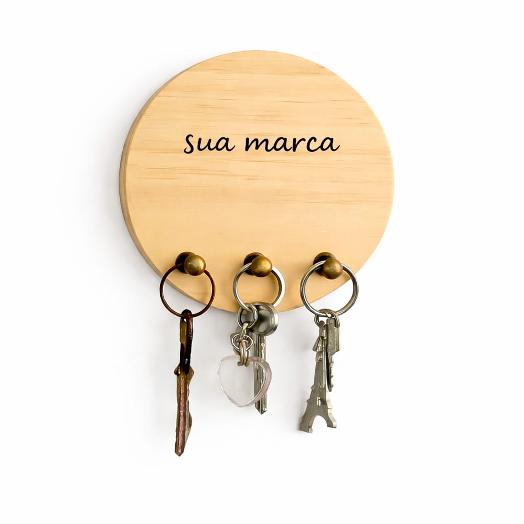 - Itens que ficam no dia a dia: O porta-chaves vai para a parede do imóvel e o chaveiro acompanha o cliente na rotina — mantendo sua marca presente muito além do dia da entrega