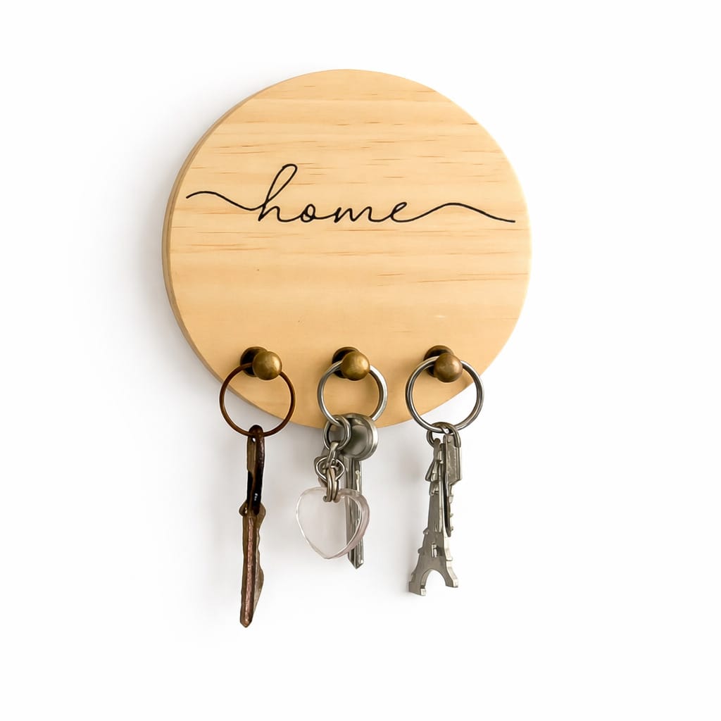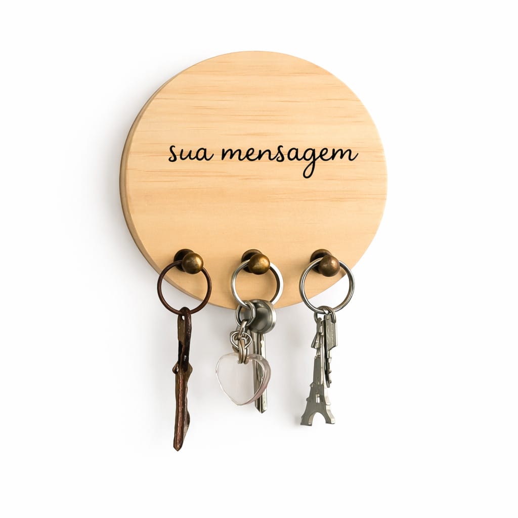 Minimalista e funcional, é perfeito para a organização do novo lar. Produzido em madeira pinus natural, possui 3 pinos em acabamento ouro velho para pendurar chaves e acompanha fita dupla face para fácil fixação. Personalização disponível.