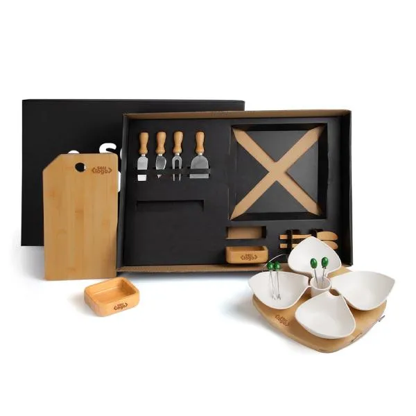 Conta com tábua, duas tigelas e duas espátulas em bambu; duas facas, uma espátula e um garfo para queijo em madeira/inox; petisqueira com base em bambu, 5 potes em fibra de bambu e 4 palitos em inox.