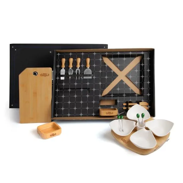 Kit para petisco e queijos com 18 peças que transforma momentos de relacionamento corporativo em experiências memoráveis com a identidade da sua empresa. Indicado para empresas que buscam brindes funcionais para presentear clientes, parceiros e colaboradores em ocasiões de confraternização, prospecção de novos negócios ou reconhecimento. Com gravação a laser na tábua e apresentação em caixa preta, o conjunto chega pronto para impressionar — e a White Brindes cuida de cada detalhe da personalização para que sua marca apareça com o cuidado que ela merece.