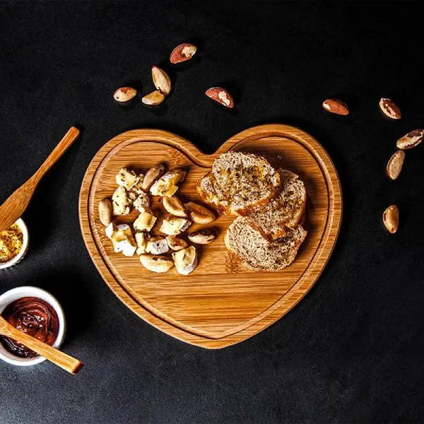 Kit para petisco com tábua em formato de coração e duas espátulas 14cm em bambu; Dois ramekins, um pequeno e um mini em porcelana. Tábua confeccionada com tripla camada invertida, para dar maior durabilidade e não deformar com o passar do tempo.