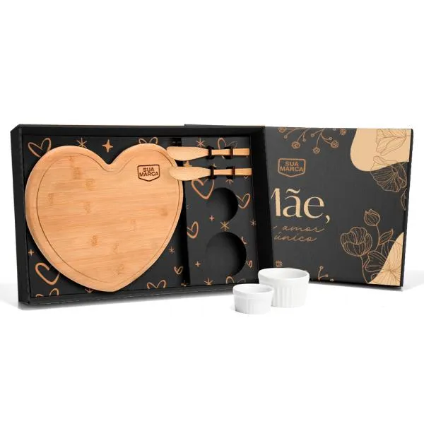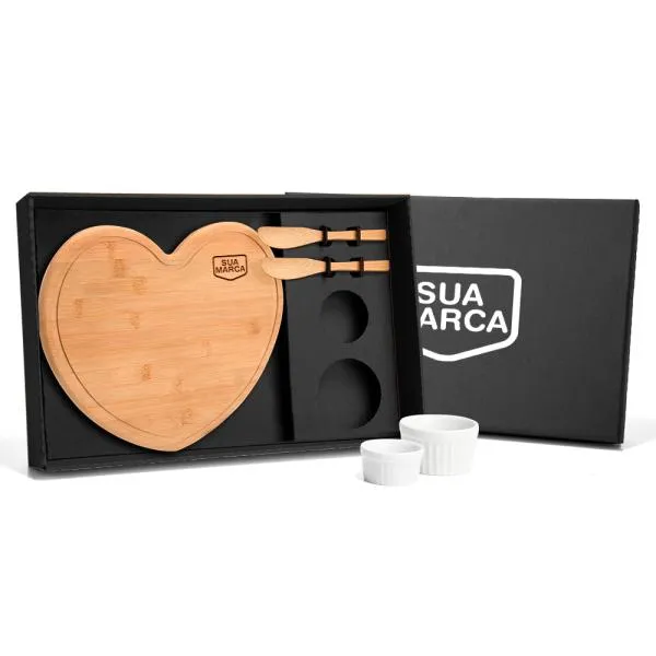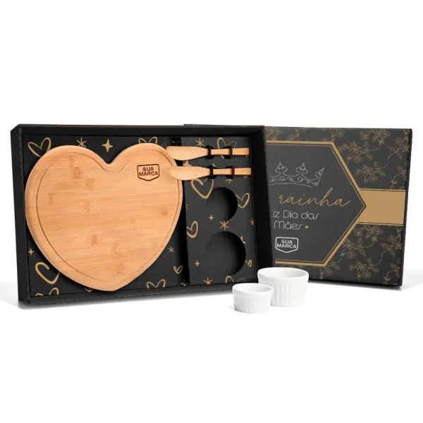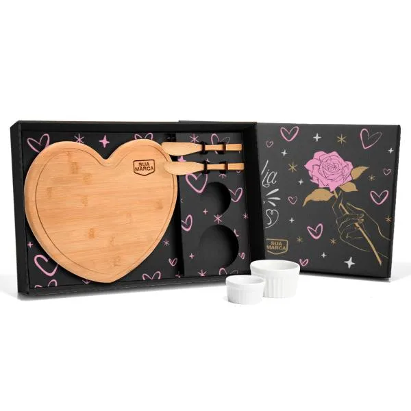 Um kit para petisco com tábua em formato de coração une utilidade e apresentação em um presente corporativo que comunica cuidado de forma concreta. Indicado para ações de reconhecimento, datas comemorativas e presentes institucionais, é uma escolha certeira para empresas que querem fortalecer vínculos com colaboradoras, clientes e parceiras. Na White Brindes, sua marca é aplicada com gravação a laser na tábua e personalização na tampa da caixa, com layout virtual gratuito antes de qualquer aprovação.