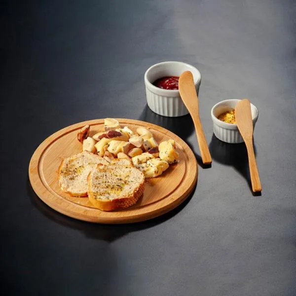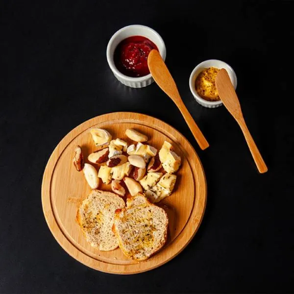 - Composição: 5 peças no total — tábua redonda, duas espátulas e dois ramekins