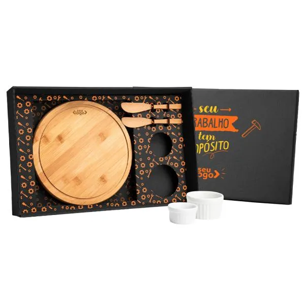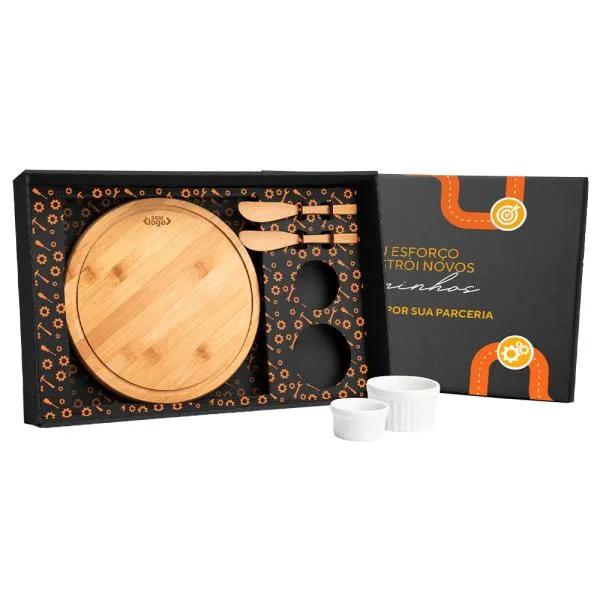 - Personalização em dois pontos de contato: A gravação a laser na tábua e a impressão na tampa da caixa garantem que a identidade da sua empresa apareça tanto no momento da entrega quanto no uso contínuo