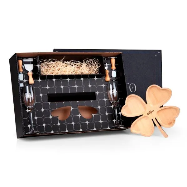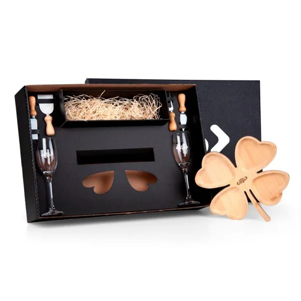 Kit de petiscos e taças para champanhe em formato de trevo de bambu, com utensílios em madeira e inox, transforma a apresentação de novos negócios, parcerias e celebrações corporativas em momentos memoráveis. Indicado para empresas que buscam brindes sofisticados para fechamento de contratos, reconhecimento de parceiros ou celebrações internas. Com gravação a laser nas taças, na petisqueira e na tampa da caixa, sua marca estará presente em cada detalhe deste presente corporativo.