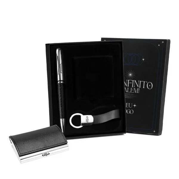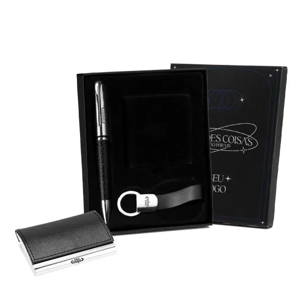 Kit executivo em metal para presentear clientes, fechar negócios ou reconhecer colaboradores com um conjunto funcional e bem acabado. Composto por porta-cartão, caneta e chaveiro, é uma solução prática para quem busca um brinde corporativo que tenha uso real no dia a dia profissional. Com gravação a laser nos três itens e embalagem em caixa preta inclusa, o kit chega pronto para entregar — sem precisar de nenhum preparo adicional.