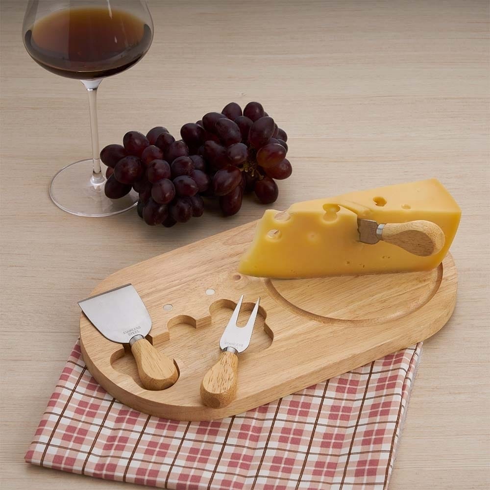 Kit queijo 4 peças, contém: tábua de madeira com canaleta, faca com ponta, garfo e espátula. Tábua com imã para encaixe e fixação dos utensílios.