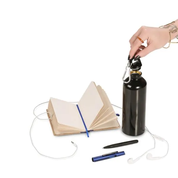 Composto por squeeze preto em alumínio revestido com verniz; fone de ouvido branco com microfone, controle de volume e estojo plástico; caderno para anotações preto com capa dura nas cores Bege e Azul e caneta em ABS azul.