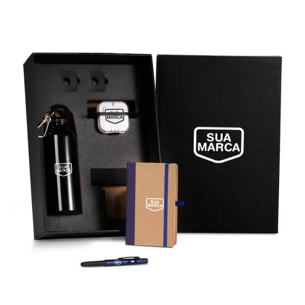 - Presença da marca em múltiplas superfícies: Com gravação em todos os itens e na tampa da caixa, sua logomarca aparece em diferentes pontos do kit, reforçando a comunicação da empresa